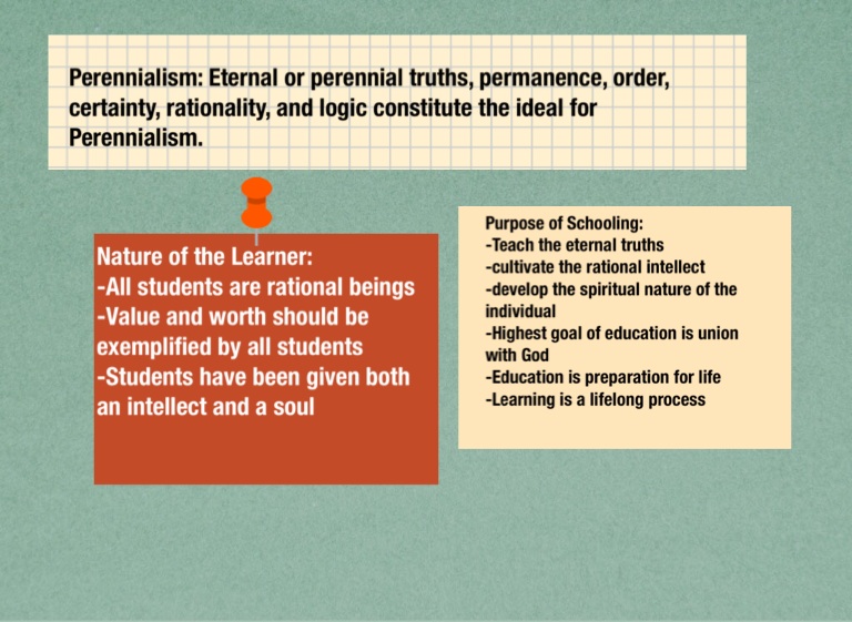 Perennialism: Eternal or perennial truths, permanence, order, certainty, rationality, and logic constitute the ideal for Perennialism.