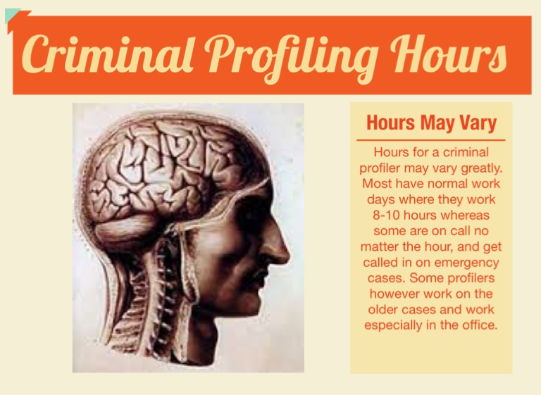 Hours for a criminal profiler may vary greatly. Most have normal work days where they work 8-10 hours whereas some are on call no matter the hour, and get called in on emergency cases. Some profilers however work on the older cases and work especially in the office.