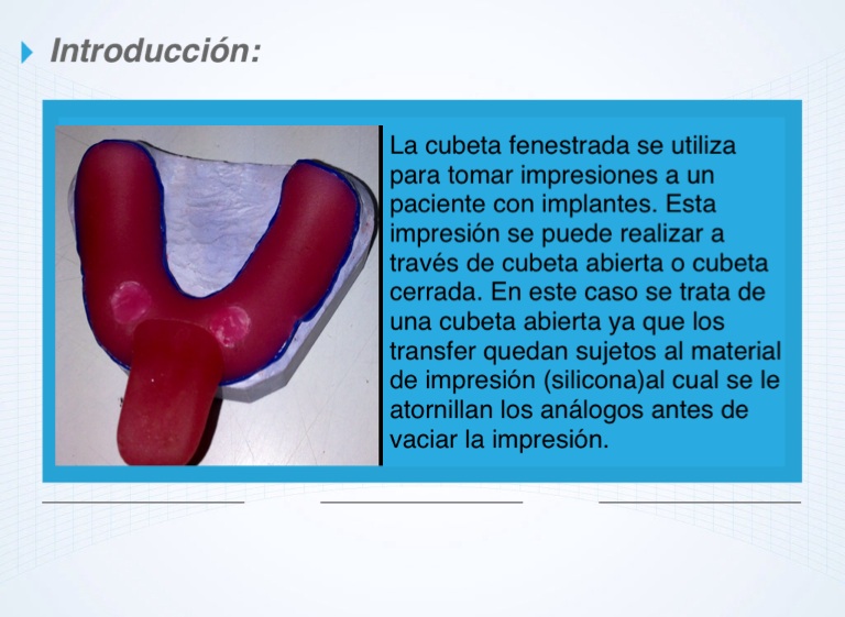 La cubeta fenestrada se utiliza para tomar impresiones a un paciente con implantes. Esta impresión se puede realizar a través de cubeta abierta o cubeta cerrada. En este caso se trata de una cubeta abierta ya que los transfer quedan sujetos al material de impresión (silicona)al cual se le atornillan los análogos antes de vaciar la impresión.