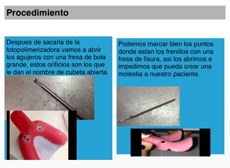 Despues de sacarla de la fotopolimerizadora vamos a abrir los agujeros con una fresa de bola grande, estos orificios son los que le dan el nombre de cubeta abierta.