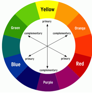 one of a pair of primary or secondary colors opposed to the other member of the pair on a schematic chart or scale (color wheel) as green opposed to red, orange opposed to blue, or violet opposed to yellow.