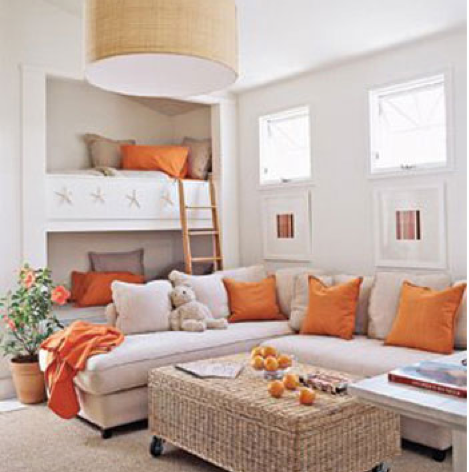 This living room/ bedroom was designed using an accented neutral color scheme because the colors used include brown, tan, white, and orange. Brown, tan and white are all neutral colors. The pop of color used is the orange.