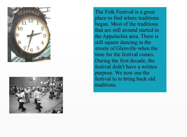 The Folk Festival is a great place to find where traditions began. Most of the traditions that are still around started in the Appalachia area. There is still square dancing in the streets of Glenville when the time for the festival comes. During the first decade, the festival didn't have a written purpose. We now use the festival to to bring back old traditions.