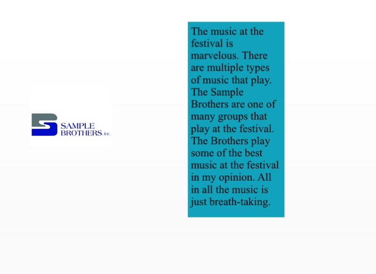 The music at the festival is marvelous. There are multiple types of music that play. The Sample Brothers are one of many groups that play at the festival. The Brothers play some of the best music at the festival in my opinion. All in all the music is just breath-taking.