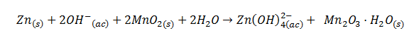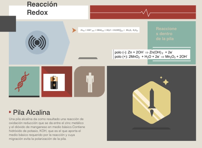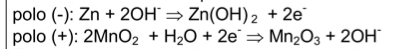 Una pila alcalina da como resultado una reacción de oxidación reducción que se da entre el zinc metálico y el dióxido de manganeso en medio básico.Contiene hidróxido de potasio, KOH, que es el que aporta el medio básico requerido por la reacción y cuya migración evita la polarización de la pila.