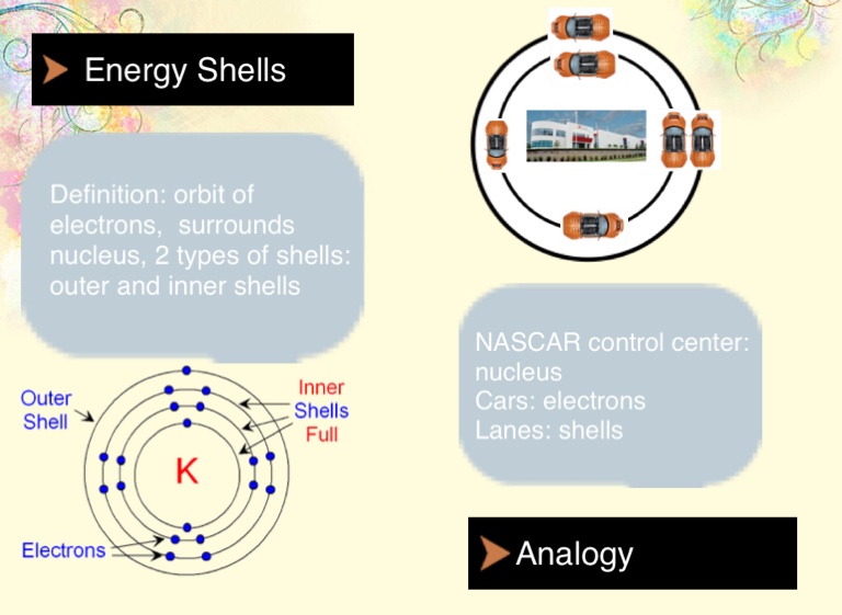 Definition: orbit of electrons, surrounds nucleus, 2 types of shells: outer and inner shells
