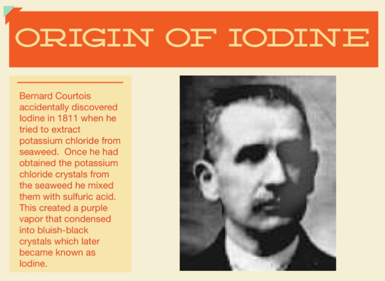 Bernard Courtois accidentally discovered Iodine in 1811 when he tried to extract potassium chloride from seaweed. Once he had obtained the potassium chloride crystals from the seaweed he mixed them with sulfuric acid. This created a purple vapor that condensed into bluish-black crystals which later became known as Iodine.