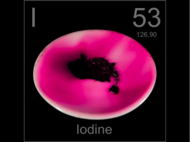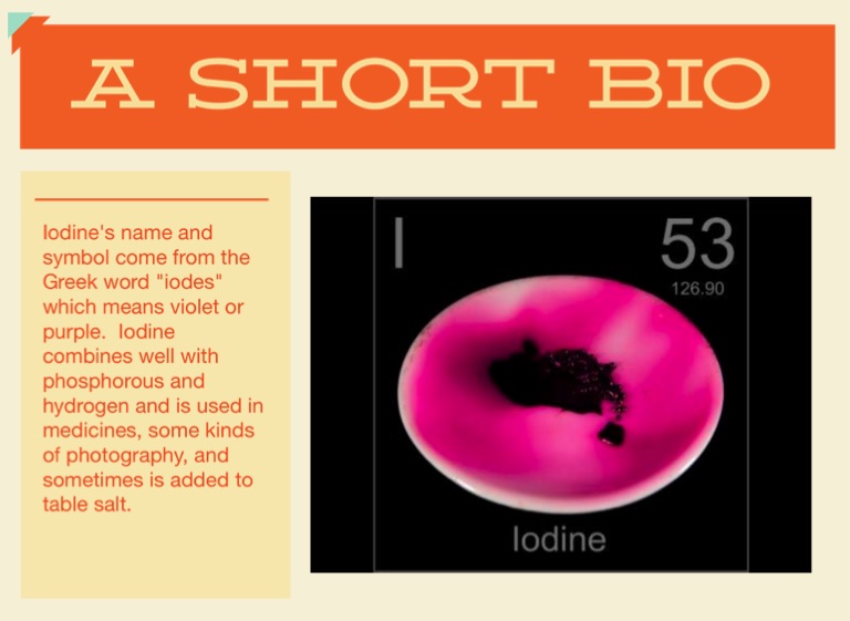 Iodine's name and symbol come from the Greek word "iodes" which means violet or purple. Iodine combines well with phosphorous and hydrogen and is used in medicines, some kinds of photography, and sometimes is added to table salt.