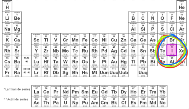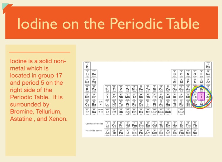 Iodine is a solid non-metal which is located in group 17 and period 5 on the right side of the Periodic Table. It is surrounded by Bromine, Tellurium, Astatine , and Xenon.
