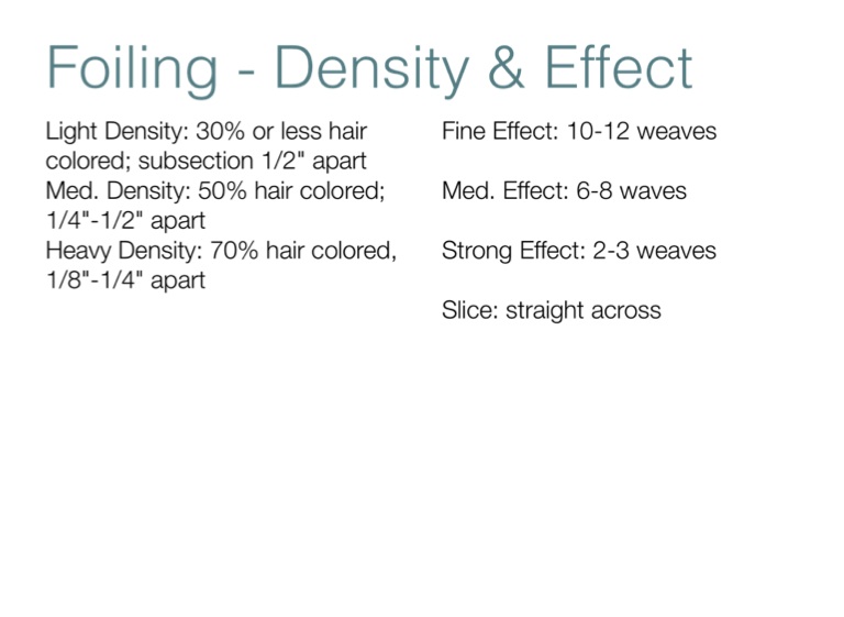 Light Density: 30% or less hair colored; subsection 1/2" apart