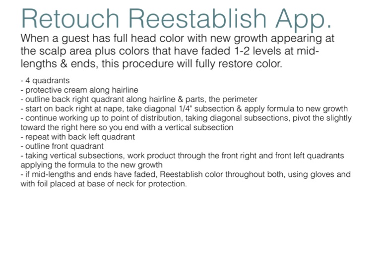 When a guest has full head color with new growth appearing at the scalp area plus colors that have faded 1-2 levels at mid-lengths & ends, this procedure will fully restore color.