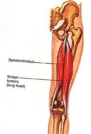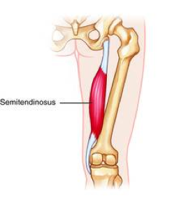 Semitendinosus- located on the posterior side of the thigh and is one of the muscles that makes up the hamstrings group; this muscle helps to extend the hip joint and to flex the knee joint while also medially rotating the tibia and femur accordingly in the flexion and extension of both joints