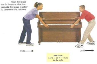 Ex: If an object is going 30 Newtons to the RIGHT and 20 newtons to the RIGHT, you would add the numbers together to get the total net force of 50 Newtons. You add the numbers together because they are going in the same direction.