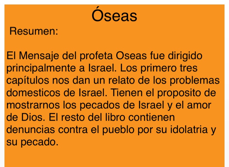 El Mensaje del profeta Oseas fue dirigido principalmente a Israel. Los primero tres capítulos nos dan un relato de los problemas domesticos de Israel. Tienen el proposito de mostrarnos los pecados de Israel y el amor de Dios. El resto del libro contienen denuncias contra el pueblo por su idolatria y su pecado.