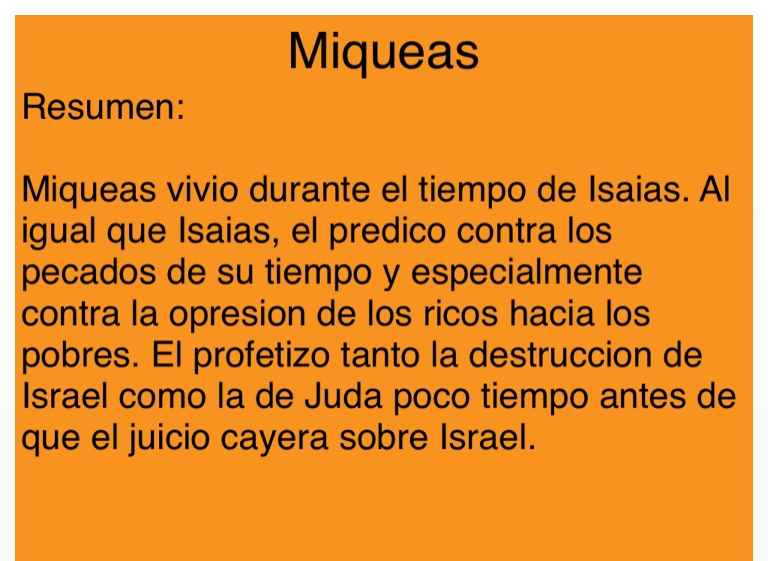 Miqueas vivio durante el tiempo de Isaias. Al igual que Isaias, el predico contra los pecados de su tiempo y especialmente contra la opresion de los ricos hacia los pobres. El profetizo tanto la destruccion de Israel como la de Juda poco tiempo antes de que el juicio cayera sobre Israel.