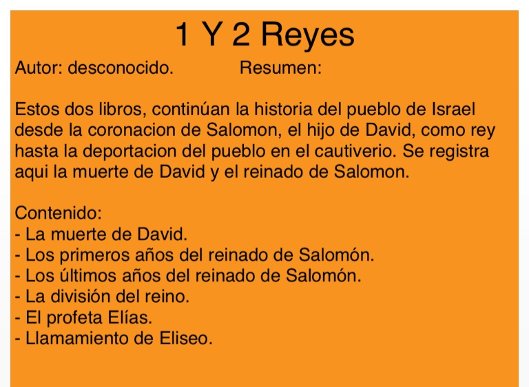 Estos dos libros, continúan la historia del pueblo de Israel desde la coronacion de Salomon, el hijo de David, como rey hasta la deportacion del pueblo en el cautiverio. Se registra aqui la muerte de David y el reinado de Salomon.
