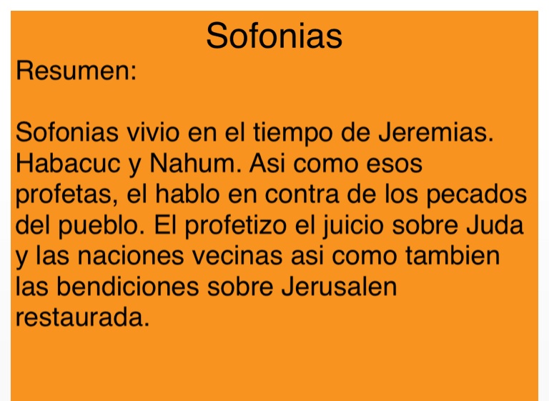 Sofonias vivio en el tiempo de Jeremias. Habacuc y Nahum. Asi como esos profetas, el hablo en contra de los pecados del pueblo. El profetizo el juicio sobre Juda y las naciones vecinas asi como tambien las bendiciones sobre Jerusalen restaurada.