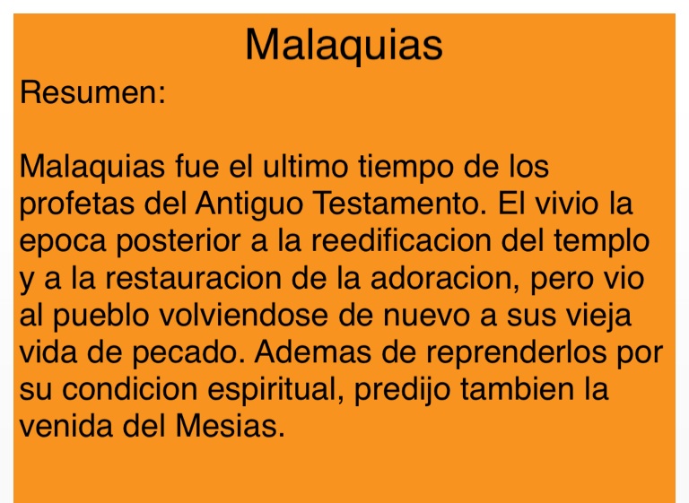 Malaquias fue el ultimo tiempo de los profetas del Antiguo Testamento. El vivio la epoca posterior a la reedificacion del templo y a la restauracion de la adoracion, pero vio al pueblo volviendose de nuevo a sus vieja vida de pecado. Ademas de reprenderlos por su condicion espiritual, predijo tambien la venida del Mesias.