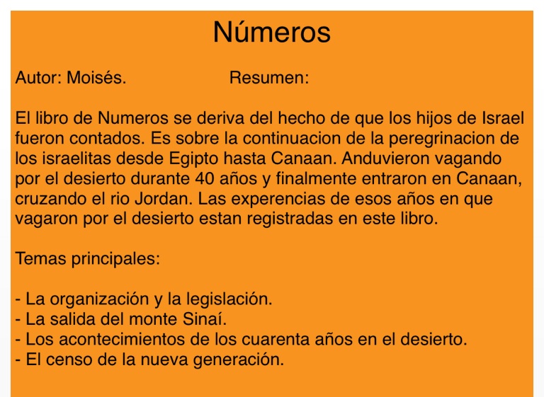 El libro de Numeros se deriva del hecho de que los hijos de Israel fueron contados. Es sobre la continuacion de la peregrinacion de los israelitas desde Egipto hasta Canaan. Anduvieron vagando por el desierto durante 40 años y finalmente entraron en Canaan, cruzando el rio Jordan. Las experencias de esos años en que vagaron por el desierto estan registradas en este libro.