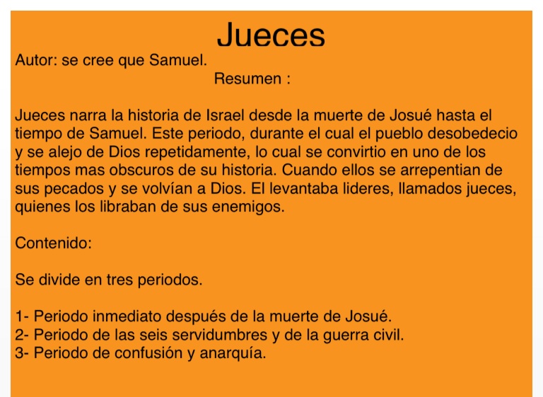 Jueces narra la historia de Israel desde la muerte de Josué hasta el tiempo de Samuel. Este periodo, durante el cual el pueblo desobedecio y se alejo de Dios repetidamente, lo cual se convirtio en uno de los tiempos mas obscuros de su historia. Cuando ellos se arrepentian de sus pecados y se volvían a Dios. El levantaba lideres, llamados jueces, quienes los libraban de sus enemigos.