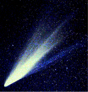 A comet is an astronomical object with a long tail composed of ice and dust. A comets orbit is elliptical.
