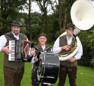 "Oompah" music, and "Volksmusic" are part of the German traditional music. The genre of Oompah music is named after the heavy presence of the tuba in the pieces and play while people Polka (a 4/4 time dance), Mazurka, Schottishe, Waltz and Landler - all European partner/group dances. Large brass bands composed of flugelhorns, clarinets, tuba's, tenorhorn, and euphoniums popularly play upbeat movements during celebrations.