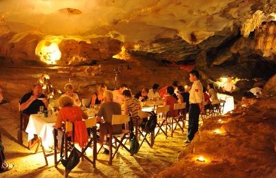 This is Ha Long Bay in Vietnam . You can take a boat ride around the bay and there's a resteraunt inside a limestone cave ^_^