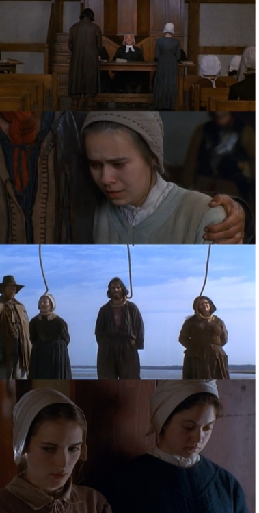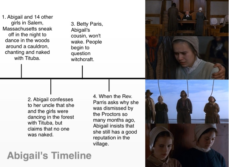 1. Abigail and 14 other girls in Salem, Massachusetts sneak off in the night to dance in the woods around a cauldron, chanting and naked with Tituba.