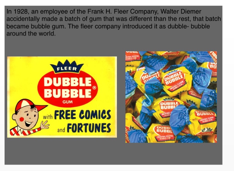 In 1928, an employee of the Frank H. Fleer Company, Walter Diemer accidentally made a batch of gum that was different than the rest, that batch became bubble gum. The fleer company introduced it as dubble- bubble around the world.