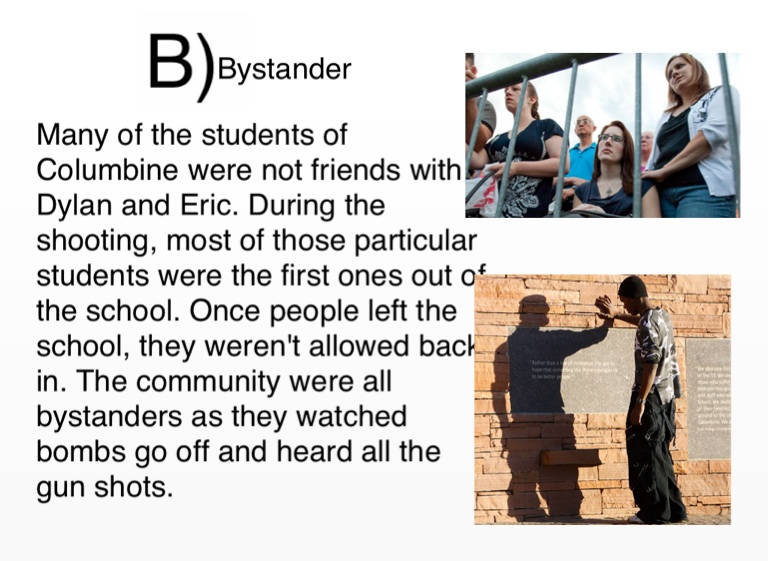 Many of the students of Columbine were not friends with Dylan and Eric. During the shooting, most of those particular students were the first ones out of the school. Once people left the school, they weren't allowed back in. The community were all bystanders as they watched bombs go off and heard all the gun shots.