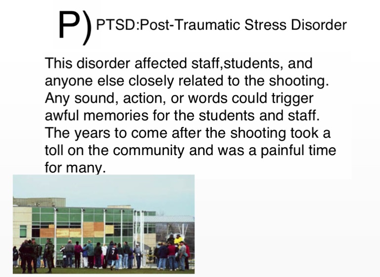 This disorder affected staff,students, and anyone else closely related to the shooting. Any sound, action, or words could trigger awful memories for the students and staff. The years to come after the shooting took a toll on the community and was a painful time for many.