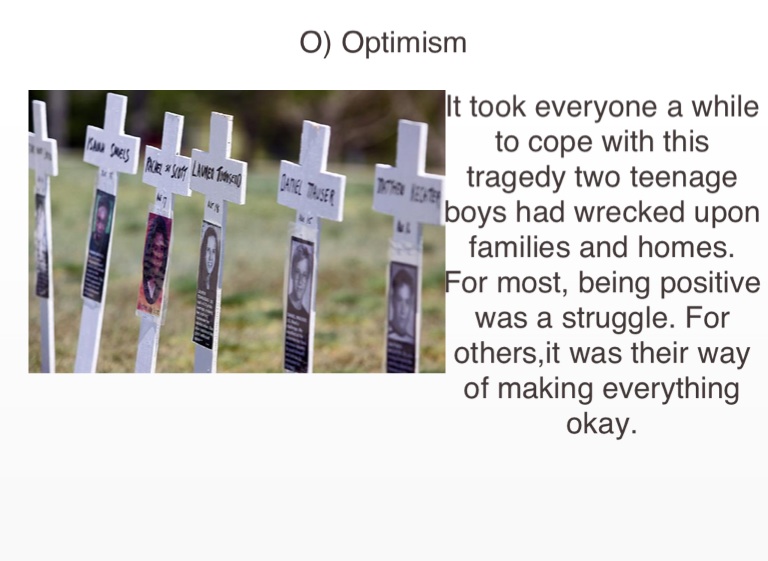 It took everyone a while to cope with this tragedy two teenage boys had wrecked upon families and homes. For most, being positive was a struggle. For others,it was their way of making everything okay.