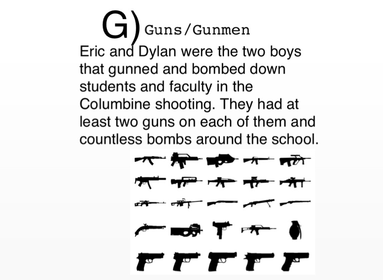 Eric and Dylan were the two boys that gunned and bombed down students and faculty in the Columbine shooting. They had at least two guns on each of them and countless bombs around the school.