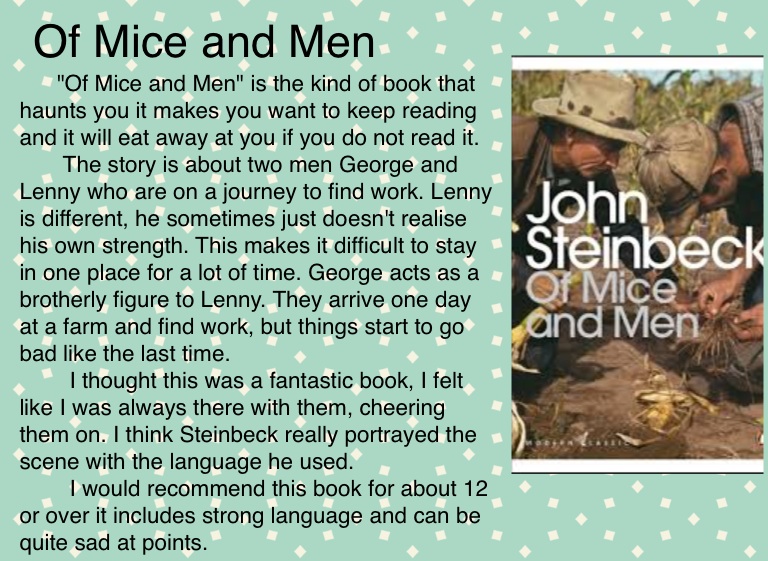 "Of Mice and Men" is the kind of book that haunts you it makes you want to keep reading and it will eat away at you if you do not read it.