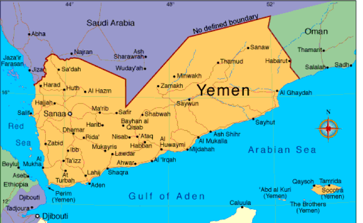 The bordering countries are Saudi Arabia and Oman. The bodies of waters that surround Yemen are the Gulf of Aden, the Arabian Sea, and the Red Sea. Yemen is located in the Middle East.