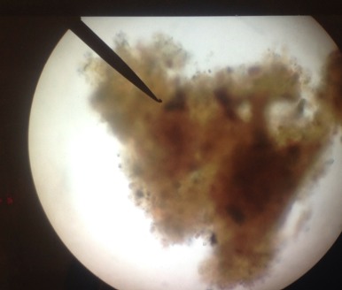 The darkened circular spots on this photomicrograph are the plant cells of the red pond water algae.