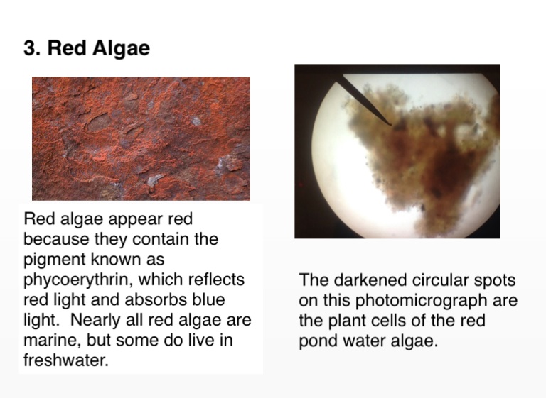 Red algae appear red because they contain the pigment known as phycoerythrin, which reflects red light and absorbs blue light. Nearly all red algae are marine, but some do live in freshwater.