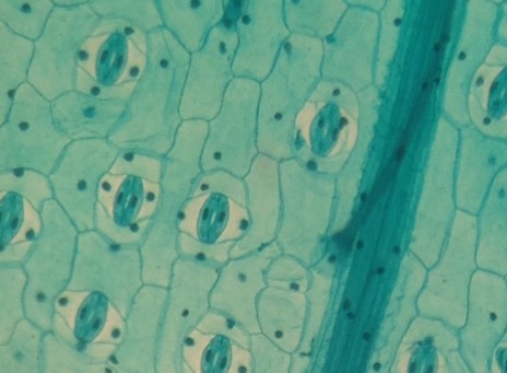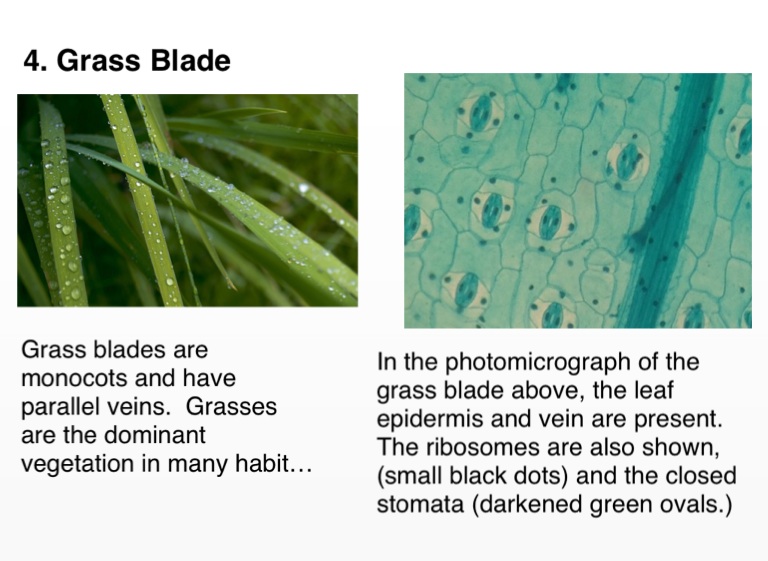 In the photomicrograph of the grass blade above, the leaf epidermis and vein are present. The ribosomes are also shown, (small black dots) and the closed stomata (darkened green ovals.)