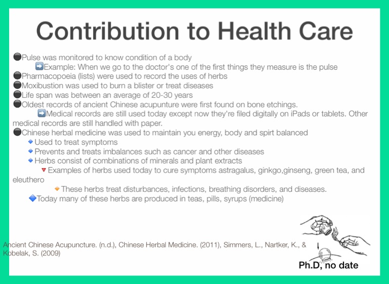 Ancient Chinese Acupuncture. (n.d.), Chinese Herbal Medicine. (2011), Simmers, L., Nartker, K., & Kobelak, S. (2009)