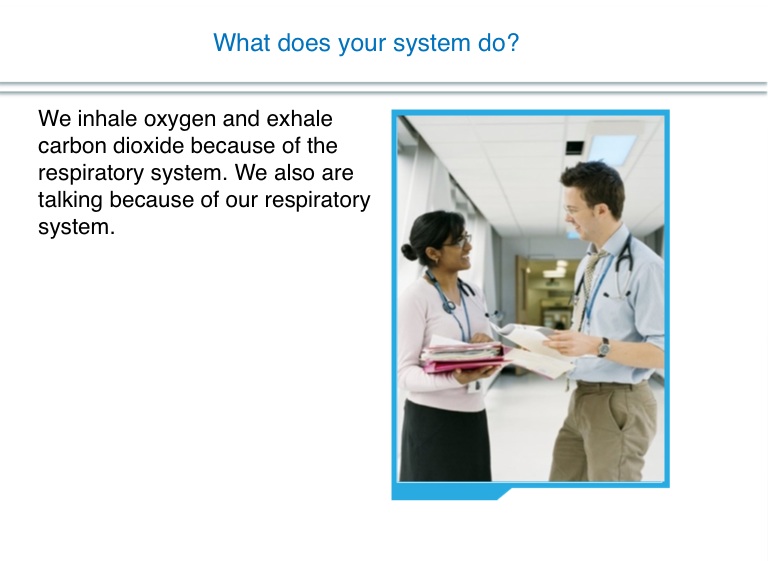 We inhale oxygen and exhale carbon dioxide because of the respiratory system. We also are talking because of our respiratory system.