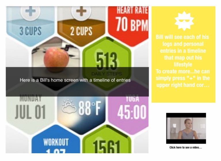 Bill will see each of his logs and personal entries in a timeline that map out his lifestyle To create more...he can simply press "+" in the upper right hand corner