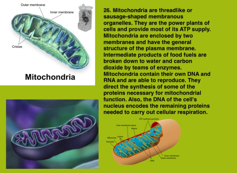 26. Mitochondria are threadlike or sausage-shaped membranous organelles. They are the power plants of cells and provide most of its ATP supply. Mitochondria are enclosed by two membranes and have the general structure of the plasma membrane. Intermediate products of food fuels are broken down to water and carbon dioxide by teams of enzymes. Mitochondria contain their own DNA and RNA and are able to reproduce. They direct the synthesis of some of the proteins necessary for mitochondrial function. Also, the DNA of the cell's nucleus encodes the remaining proteins needed to carry out cellular respiration.