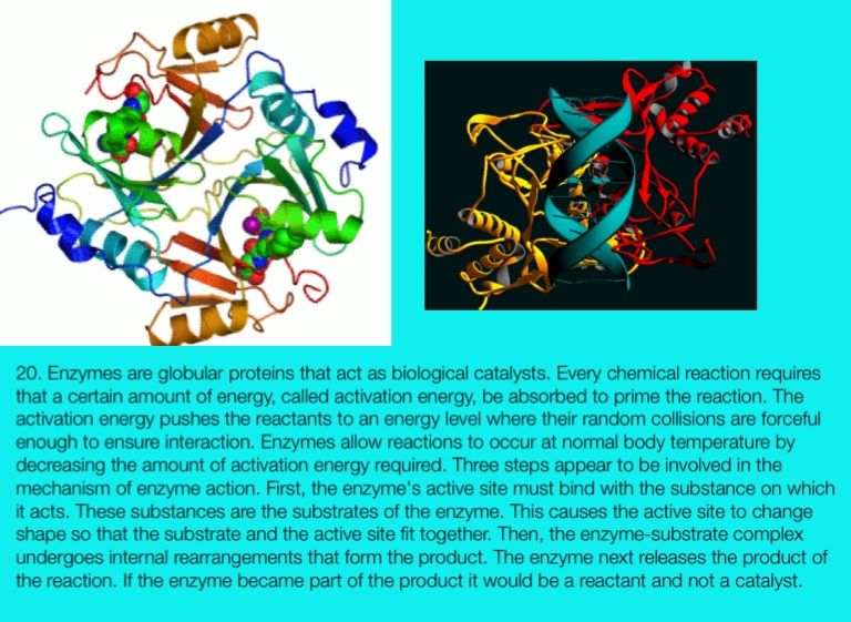20. Enzymes are globular proteins that act as biological catalysts. Every chemical reaction requires that a certain amount of energy, called activation energy, be absorbed to prime the reaction. The activation energy pushes the reactants to an energy level where their random collisions are forceful enough to ensure interaction. Enzymes allow reactions to occur at normal body temperature by decreasing the amount of activation energy required. Three steps appear to be involved in the mechanism of enzyme action. First, the enzyme's active site must bind with the substance on which it acts. These substances are the substrates of the enzyme. This causes the active site to change shape so that the substrate and the active site fit together. Then, the enzyme-substrate complex undergoes internal rearrangements that form the product. The enzyme next releases the product of the reaction. If the enzyme became part of the product it would be a reactant and not a catalyst.