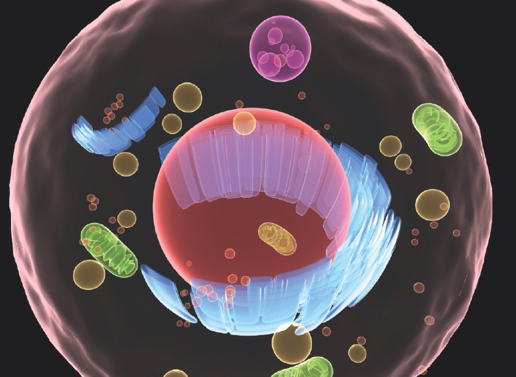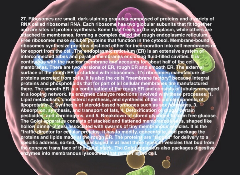 27. Ribosomes are small, dark-staining granules composed of proteins and a variety of RNA called ribosomal RNA. Each ribosome has two globular subunits that fit together and are sites of protein synthesis. Some float freely in the cytoplasm, while others are attached to membranes, forming a complex called the rough endoplasmic reticulum. Free ribosomes make soluble proteins that function in the cytosol. Membrane-bound ribosomes synthesize proteins destined either for incorporation into cell membranes or for export from the cell. The endoplasmic reticulum (ER) is an extensive system of interconnected tubes and parallel membranes enclosing fluid-filled cavities. It is continuous with the nuclear membrane and accounts for about half of the cell membranes. There are two versions of ER, rough ER and smooth ER. The external surface of the rough ER is studded with ribosomes. It's ribosomes manufacture all proteins secreted from cells. It is also the cells "membrane factory" because integral proteins and phospholipids that for part of all cellular membranes are manufactured there. The smooth ER is a continuation of the rough ER and consists of tubules arranged in a looping network. Its enzymes catalyze reactions involved with these processes: 1. Lipid metabolism, cholesterol synthesis, and synthesis of the lipid components of lipoproteins, 2. Synthesis of steroid-based hormones such as sex hormones, 3. Absorption, synthesis, and transport of fats, 4. Detoxification of drugs, certain pesticides, and carcinogens, and 5. Breakdown of stored glycogen to form free glucose. The Golgi apparatus consists of stacked and flattened membranous sacs, shaped like hollow dinner plates, associated with swarms of tiny membranous vesicles. It is the "traffic director for cellular proteins. It has to modify, concentrate, and package the proteins and lipids made at the rough ER. The proteins are "tagged" for delivery to a specific address, sorted, and packaged in at least three types of vesicles that bud from the concave trans face of the Golgi stack. The Golgi apparatus also packages digestive enzymes into membranous lysosomes that remain in the cell.