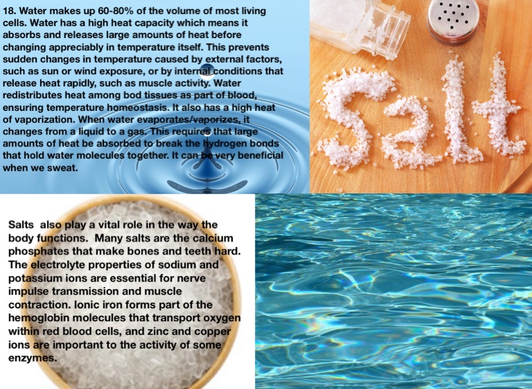 18. Water makes up 60-80% of the volume of most living cells. Water has a high heat capacity which means it absorbs and releases large amounts of heat before changing appreciably in temperature itself. This prevents sudden changes in temperature caused by external factors, such as sun or wind exposure, or by internal conditions that release heat rapidly, such as muscle activity. Water redistributes heat among bod tissues as part of blood, ensuring temperature homeostasis. It also has a high heat of vaporization. When water evaporates/vaporizes, it changes from a liquid to a gas. This requires that large amounts of heat be absorbed to break the hydrogen bonds that hold water molecules together. It can be very beneficial when we sweat.