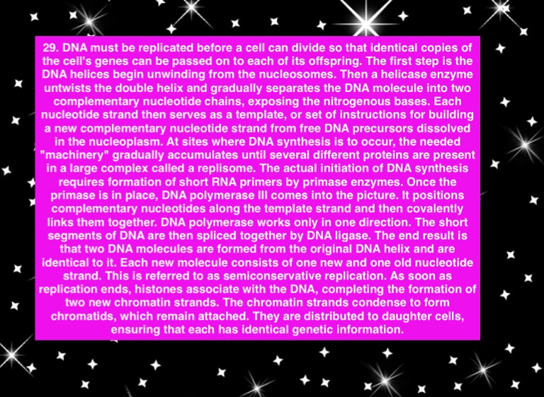 29. DNA must be replicated before a cell can divide so that identical copies of the cell's genes can be passed on to each of its offspring. The first step is the DNA helices begin unwinding from the nucleosomes. Then a helicase enzyme untwists the double helix and gradually separates the DNA molecule into two complementary nucleotide chains, exposing the nitrogenous bases. Each nucleotide strand then serves as a template, or set of instructions for building a new complementary nucleotide strand from free DNA precursors dissolved in the nucleoplasm. At sites where DNA synthesis is to occur, the needed "machinery" gradually accumulates until several different proteins are present in a large complex called a replisome. The actual initiation of DNA synthesis requires formation of short RNA primers by primase enzymes. Once the primase is in place, DNA polymerase III comes into the picture. It positions complementary nucleotides along the template strand and then covalently links them together. DNA polymerase works only in one direction. The short segments of DNA are then spliced together by DNA ligase. The end result is that two DNA molecules are formed from the original DNA helix and are identical to it. Each new molecule consists of one new and one old nucleotide strand. This is referred to as semiconservative replication. As soon as replication ends, histones associate with the DNA, completing the formation of two new chromatin strands. The chromatin strands condense to form chromatids, which remain attached. They are distributed to daughter cells, ensuring that each has identical genetic information.