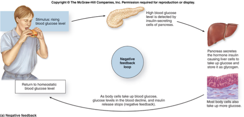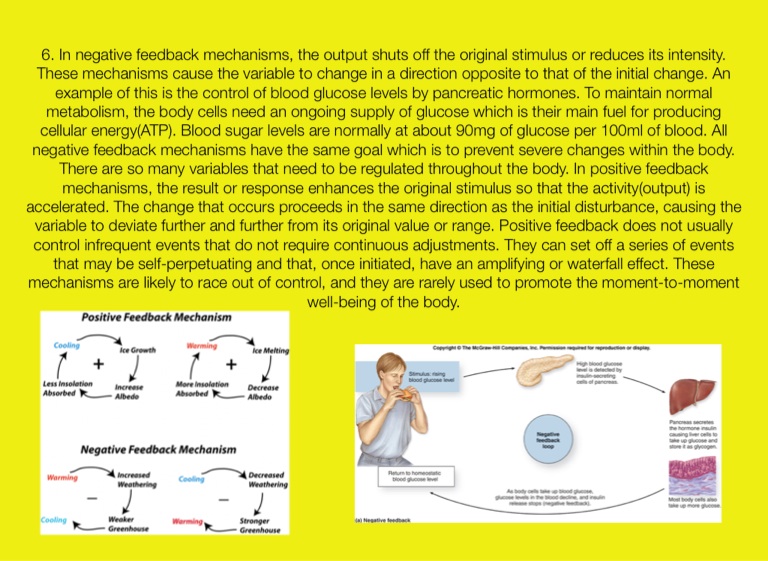 6. In negative feedback mechanisms, the output shuts off the original stimulus or reduces its intensity. These mechanisms cause the variable to change in a direction opposite to that of the initial change. An example of this is the control of blood glucose levels by pancreatic hormones. To maintain normal metabolism, the body cells need an ongoing supply of glucose which is their main fuel for producing cellular energy(ATP). Blood sugar levels are normally at about 90mg of glucose per 100ml of blood. All negative feedback mechanisms have the same goal which is to prevent severe changes within the body. There are so many variables that need to be regulated throughout the body. In positive feedback mechanisms, the result or response enhances the original stimulus so that the activity(output) is accelerated. The change that occurs proceeds in the same direction as the initial disturbance, causing the variable to deviate further and further from its original value or range. Positive feedback does not usually control infrequent events that do not require continuous adjustments. They can set off a series of events that may be self-perpetuating and that, once initiated, have an amplifying or waterfall effect. These mechanisms are likely to race out of control, and they are rarely used to promote the moment-to-moment well-being of the body.