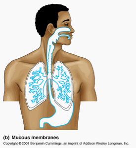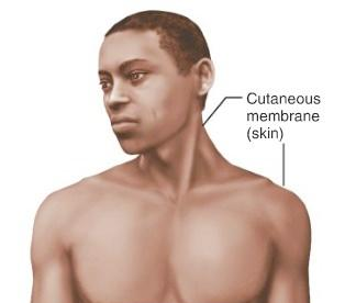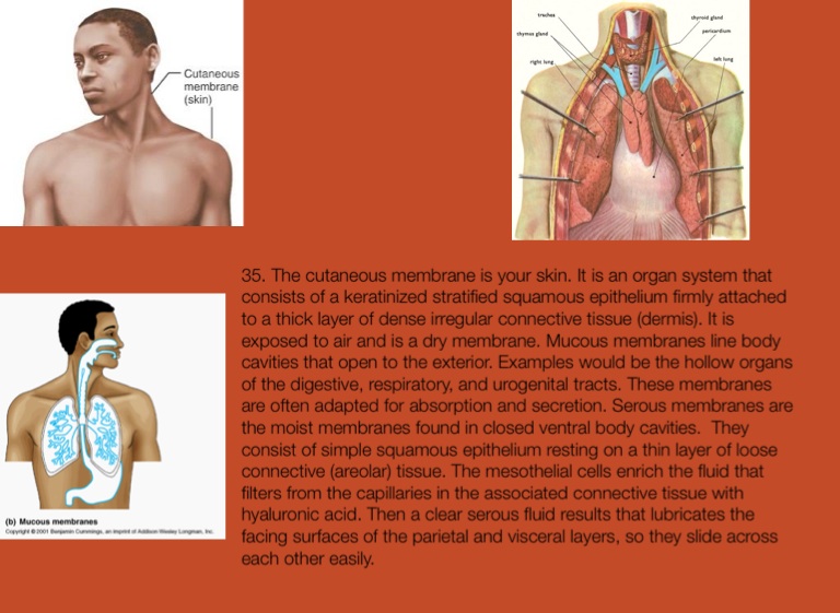 35. The cutaneous membrane is your skin. It is an organ system that consists of a keratinized stratified squamous epithelium firmly attached to a thick layer of dense irregular connective tissue (dermis). It is exposed to air and is a dry membrane. Mucous membranes line body cavities that open to the exterior. Examples would be the hollow organs of the digestive, respiratory, and urogenital tracts. These membranes are often adapted for absorption and secretion. Serous membranes are the moist membranes found in closed ventral body cavities. They consist of simple squamous epithelium resting on a thin layer of loose connective (areolar) tissue. The mesothelial cells enrich the fluid that filters from the capillaries in the associated connective tissue with hyaluronic acid. Then a clear serous fluid results that lubricates the facing surfaces of the parietal and visceral layers, so they slide across each other easily.