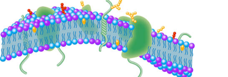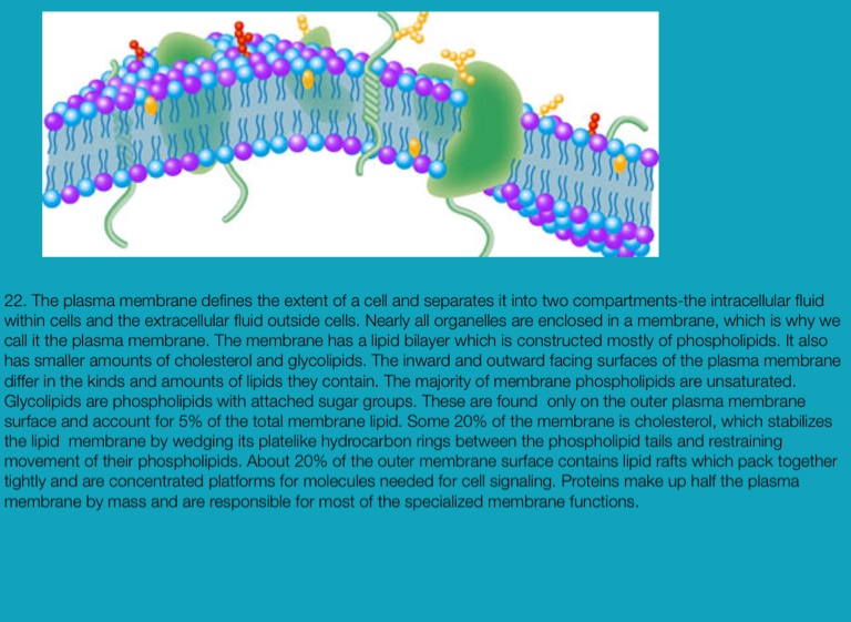 22. The plasma membrane defines the extent of a cell and separates it into two compartments-the intracellular fluid within cells and the extracellular fluid outside cells. Nearly all organelles are enclosed in a membrane, which is why we call it the plasma membrane. The membrane has a lipid bilayer which is constructed mostly of phospholipids. It also has smaller amounts of cholesterol and glycolipids. The inward and outward facing surfaces of the plasma membrane differ in the kinds and amounts of lipids they contain. The majority of membrane phospholipids are unsaturated. Glycolipids are phospholipids with attached sugar groups. These are found only on the outer plasma membrane surface and account for 5% of the total membrane lipid. Some 20% of the membrane is cholesterol, which stabilizes the lipid membrane by wedging its platelike hydrocarbon rings between the phospholipid tails and restraining movement of their phospholipids. About 20% of the outer membrane surface contains lipid rafts which pack together tightly and are concentrated platforms for molecules needed for cell signaling. Proteins make up half the plasma membrane by mass and are responsible for most of the specialized membrane functions.