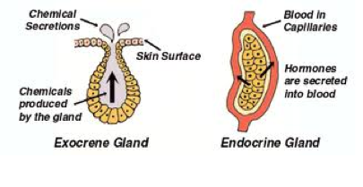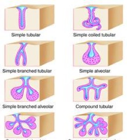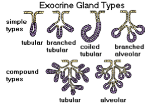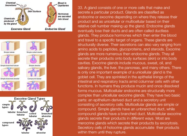 33. A gland consists of one or more cells that make and secrete a particular product. Glands are classified as endocrine or exocrine depending on where they release their product and as unicellular or multicellular based on their relative cell number making up the gland. Endocrine glands eventually lose their ducts and are often called ductless glands. They produce hormones which then enter the blood and travel to a specific target of organs. These glands are structurally diverse. Their secretions can also vary ranging from amino acids to peptides, glycoproteins, and steroids. Exocrine glands are more numerous then endocrine glands. They all secrete their products onto body surfaces (skin) or into body cavities. Exocrine glands include mucous, sweat, oil, and salivary glands, the liver, the pancreas, and many others. There is only one important example of a unicellular gland is the goblet cell. They are sprinkled in the epithelial linings of the intestinal and respiratory tracts amid columnar cells with other functions. In humans they produce mucin and once dissolved forms mucous. Multicellular endocrine are structurally more complex than unicellular exocrine glands. They have two basic parts: an epithelium-derived duct and a secretory unit consisting of secretory cells. Multicellular glands are simple or compound. Simple glands have an unbranched duct, while compound glands have a branched duct. Multicellular exocrine glands secrete their products in different ways. Most are merocrine glands which secrete their products by exocytosis. Secretory cells of holocrine glands accumulate their products within them until they rupture.